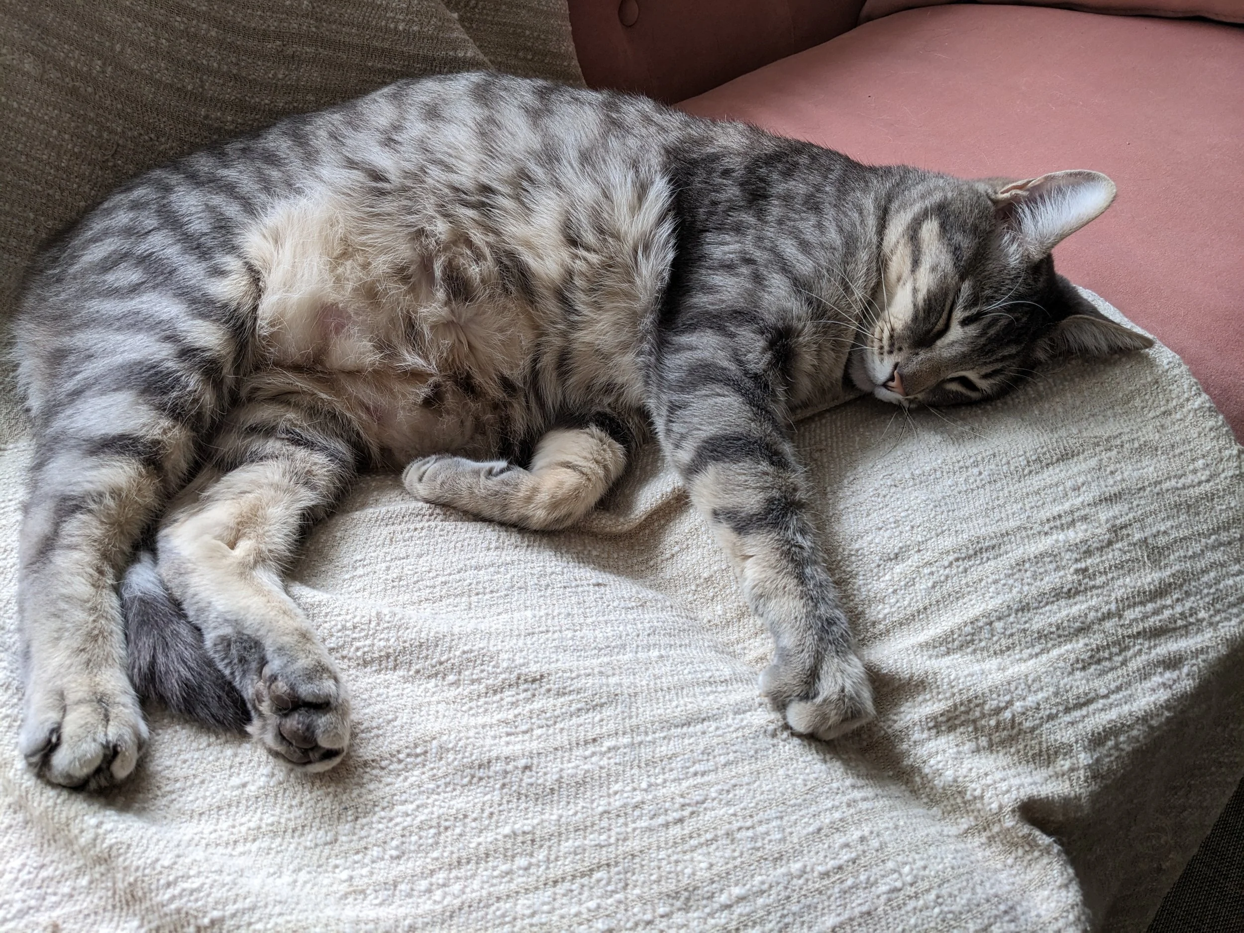 See them grooming themself afterward, washing their face first, then the backs of their ears with one paw, then the other. See them groom themselves all over, in their favorite spot, safe at home.